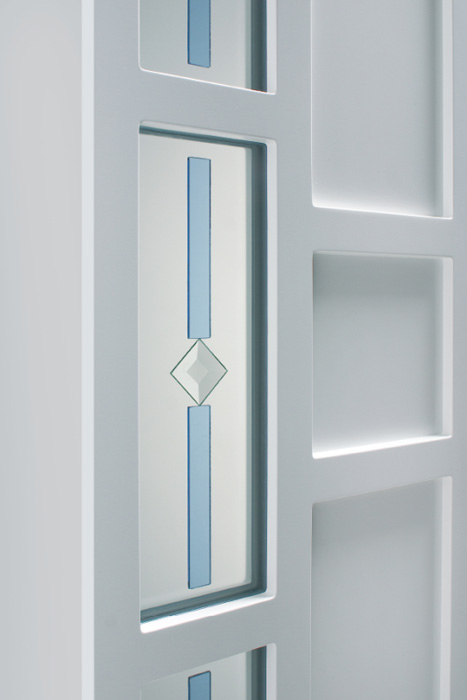 Iso-Glas Satinato weiss mit klarem Facetten- und Stern- und Rillenschliff im Scheibenzwischenraum. Oder Iso-Bleiverglasung Refloglas,