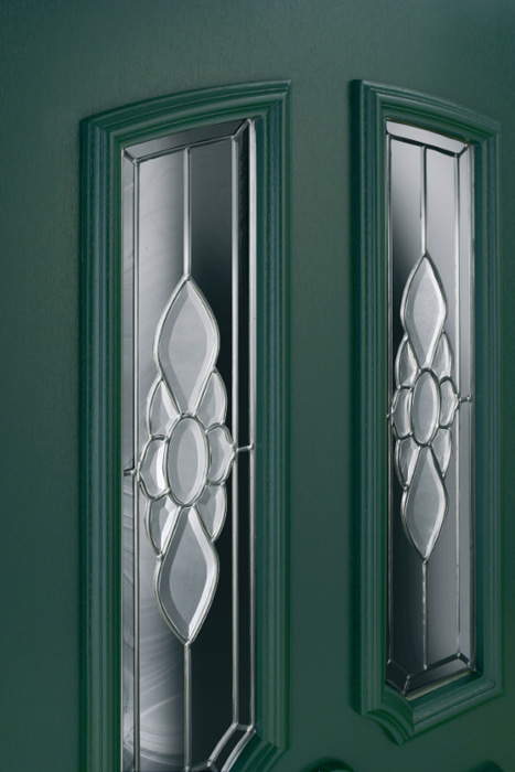 waagerechte Streifen Eisblumenglas, Facettenmotiv Klarglas mit Sternschliff. Ausserdem möglich: Holzdekor mit Iso-Bleiverglasung.
